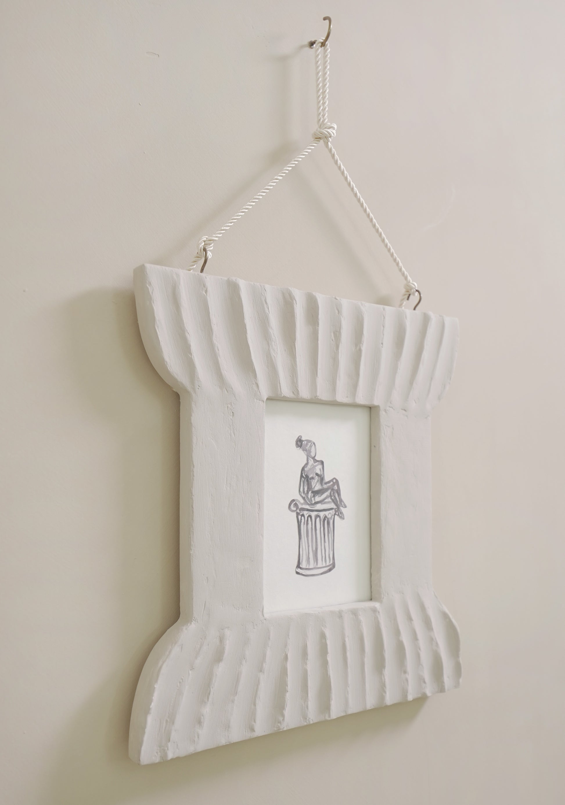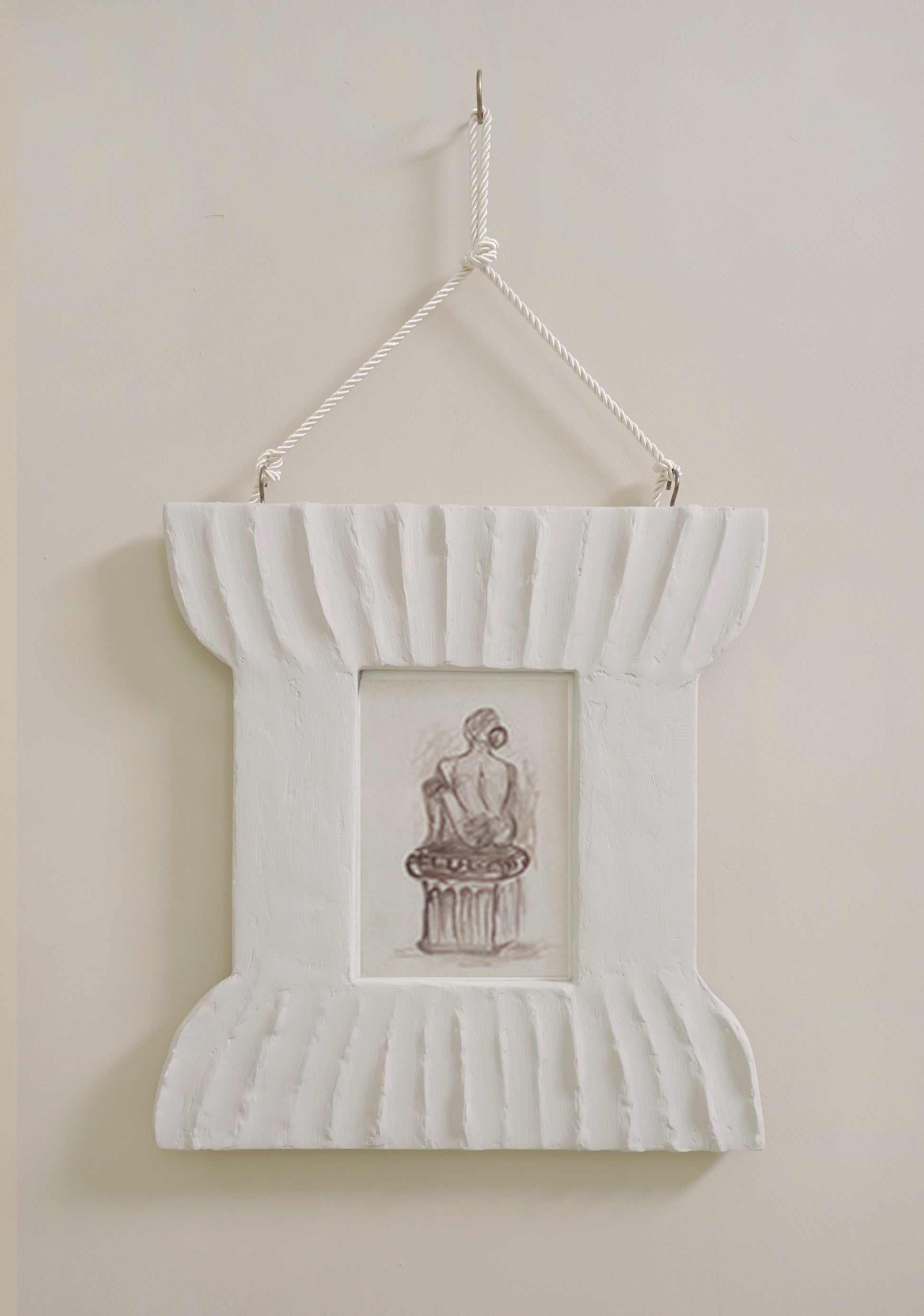 Elinora captures the same sculptural spirit as our signature Elisabetta, reimagined in a more intimate scale. Hand-formed from papier mâché and finished in a soft limewash, she brings warmth, texture, and quiet character to any surface. Each frame arrives with a charcoal sketch by artist Maggie Matthews — a piece that celebrates feminine form and material contrast — yet the artwork can be easily swapped to make it entirely your own. Thoughtful in proportion and rich in detail, Elinora is a study in timeless craft.